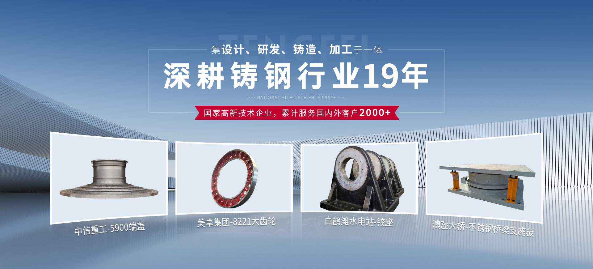 騰飛鑄鋼成立于2006年,位于全國鑄造基地河南省新鄉市,擁有員工300余人,是一家從事150噸以下碳鋼、低合金鋼、不銹鋼鑄鋼件研發、制造、服務為一體的國家高新技術企業?! 」就ㄟ^了ISO9001國際質量管理體系認證,擁有2項發明專 利,2項河南省科技成果、25項實用新型技術,通過了“環??冃гu級B級企業”驗收,先后榮獲“河南省鑄造行業綠色發展企業”、 “河南省科技型中小企業”、“河南省專精特新中小企業”等榮譽稱號?! 」緭碛?臺25噸電爐,4臺大型天燃氣熱處理爐、10米回旋自動拋丸機一臺, φ8m數控立車、φ10m數控滾齒機等各類高精裝備100余臺套,年產能3萬余噸,能為客戶提供從產品設計、木模加工、大型鑄造、大型加工一站式服務,產品廣泛應用于建材、冶金、鍛壓、冶金、水工、路橋、化工等多個重型行業?! ¢L期服務于中信重工、中船重工、美卓、上海中交、萊歇、寶武、濟南重工等全球知名企業,在行業內擁有較高的市場知名度和美譽度。